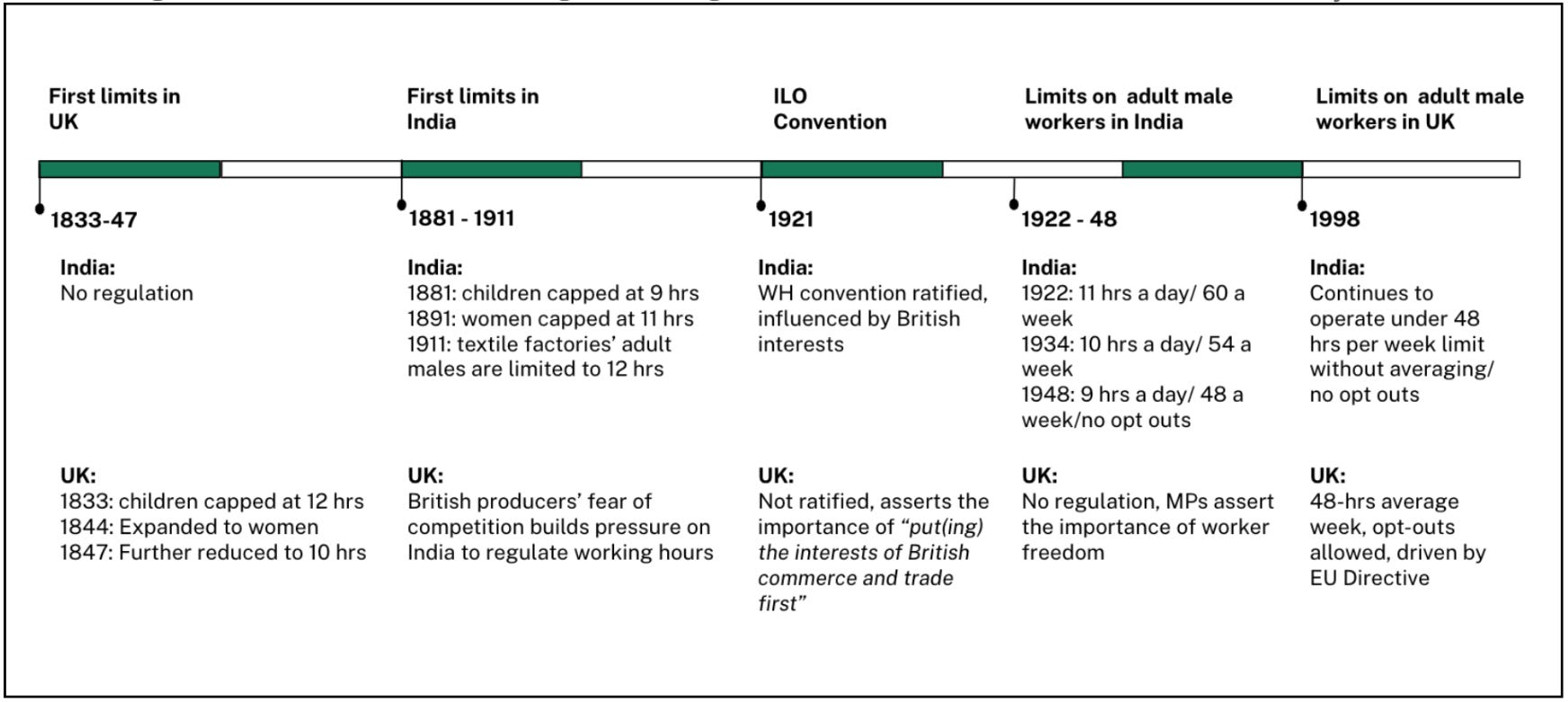 India first regulated working hours 60 years after the UK, but hardcoded them 60 years before. The UK took a very pro-worker-freedom approach. They introduced safety limits for children and women 20 years earlier than we did, but we universalised them much earlier. They treated working time as an economic variable; we treated it as a uniform welfare entitlement. They trusted individual bargaining and workplace agreements; we set inflexible statutory limits. They allowed opt-outs; we insisted on no exceptions. They debated which international rules best fit context and only adopted limits under external pressure; we accepted global standards and internalised them as permanent, universal constraints.