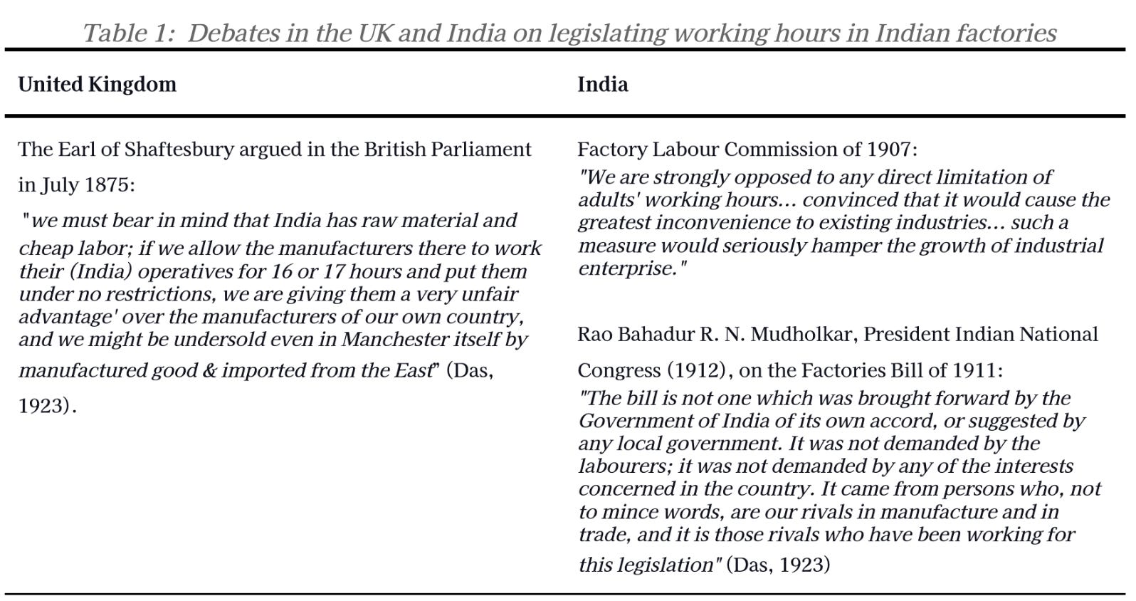 This article takes an economic history view and asks how India got here. It examines the evolution of working hour limits in colonial India and in the UK. Specifically, the analysis shows how British protectionism and the British Raj’s need to preserve order catalysed the first limits on working hours in India. Finally, we distil lessons from history on the choices India faces today as it seeks to become a manufacturing powerhouse.